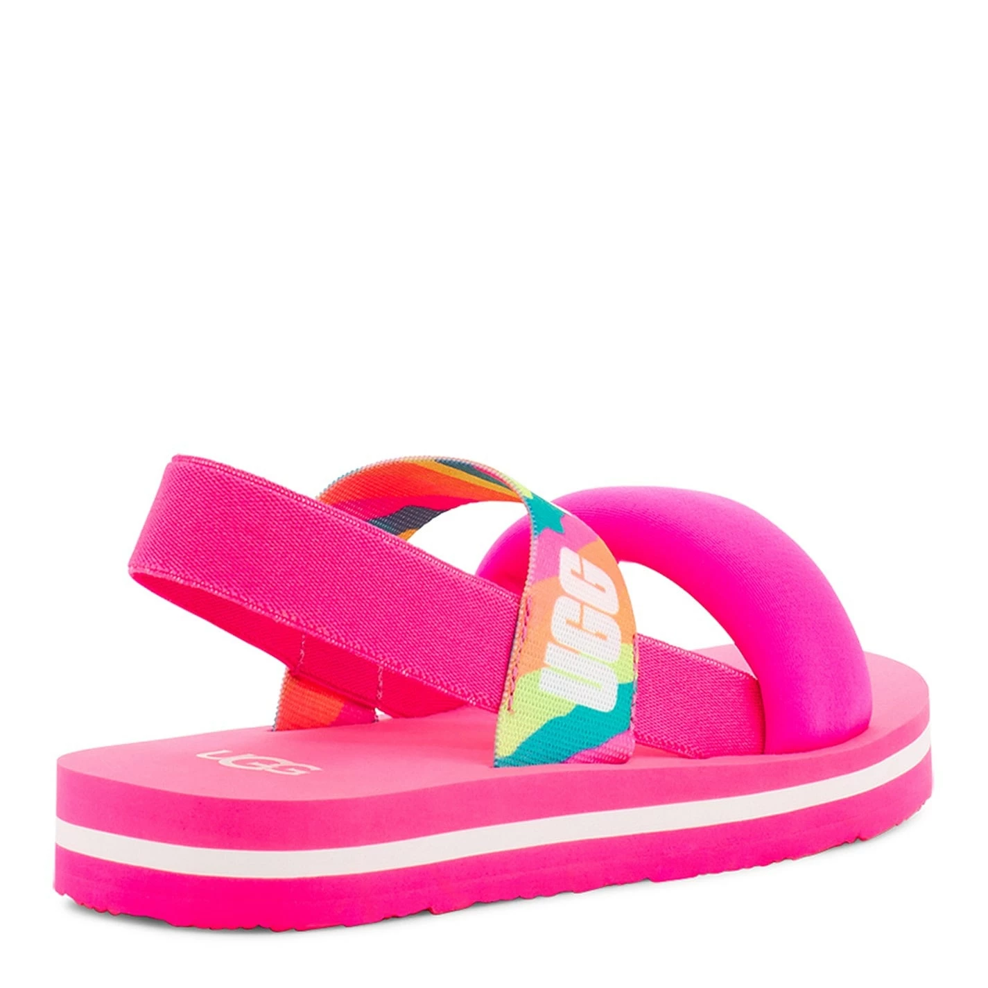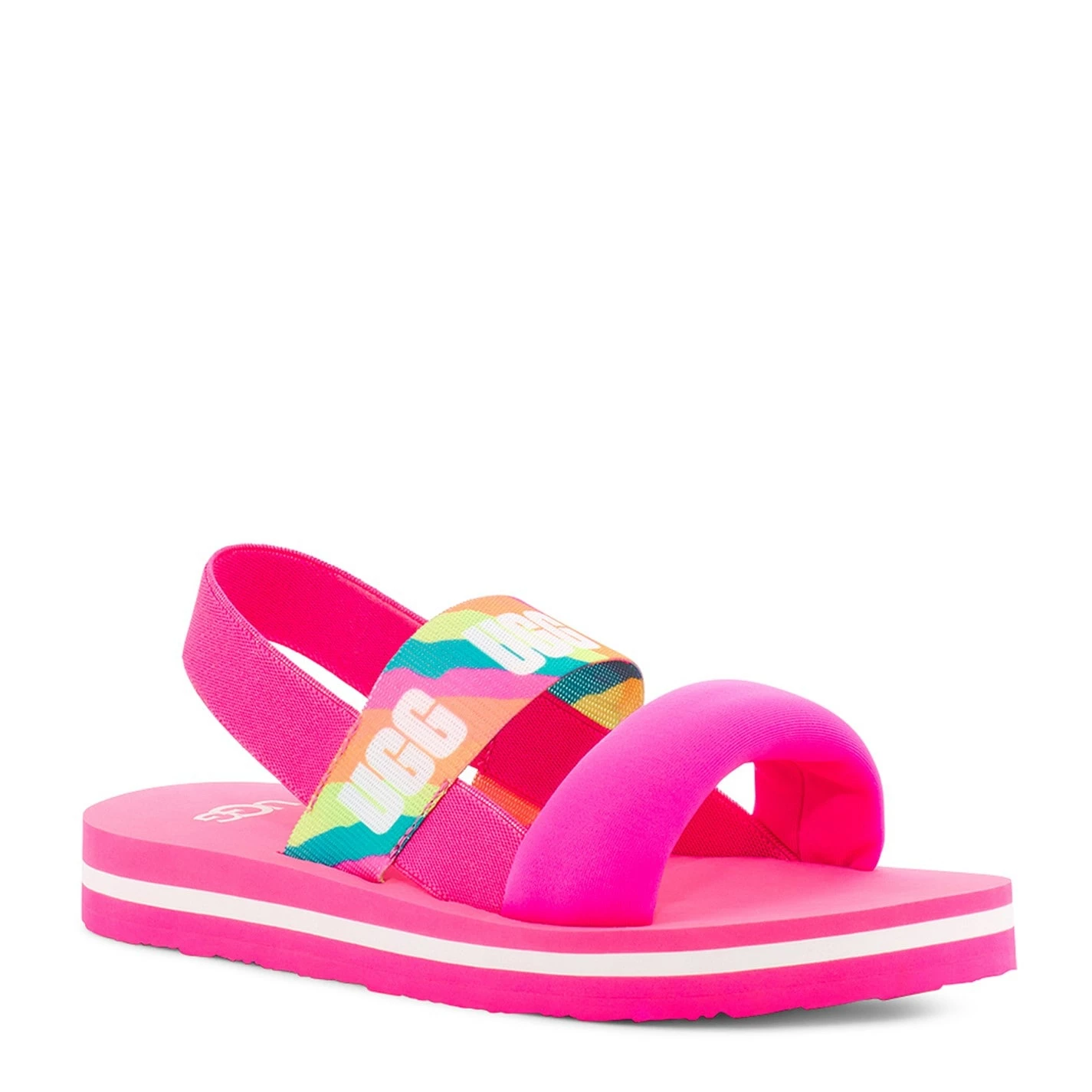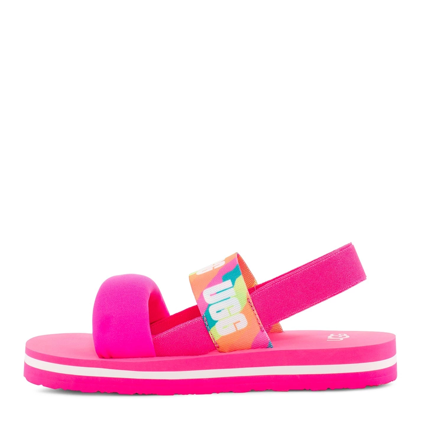 Refresh your little ones holiday collection with these Zuma Sling Slide Sandals by Ugg. Crafted on top of an EVA mid and outersole for premium comfort, this elegant pair feature a nylon upper section with a strappy design for a classic look. With an elasticated gore for a customizable fit, this pair are then finished with the Ugg branding for a premium look.